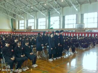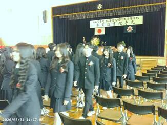 3月1日(日)10時より本校の第74回卒業証書授与式が行われました。厳粛な雰囲気の中、校長やPTA会長からの激励等、温かみのある式典となり、3年生の旅立ちを和やかに祝うことが出来ました。卒業生も思い出が蘇ってきたのか、退場時に涙を浮かべている生徒が多くいました。3年生の皆さんが思い描く未来に大きく羽ばたいていくことを期待しています。在校生の皆さん、先輩方が残してくれたものに上積みしていく番となります。焦らず、一歩一歩、歩みを進めていきましょう。